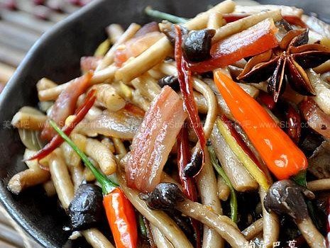 【原料】新鲜茶树菇,腊肉,小米辣,葱白,姜,蒜,八角,干红辣椒